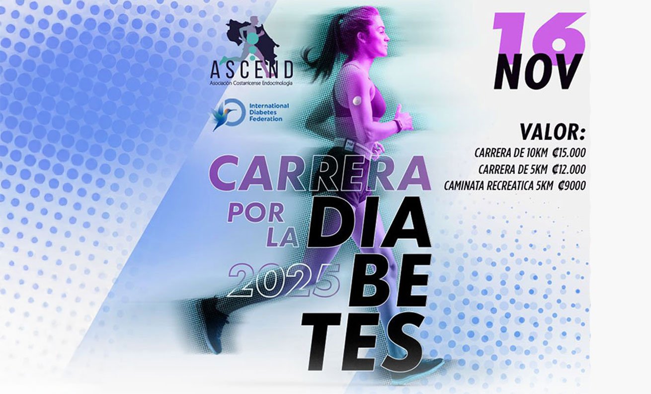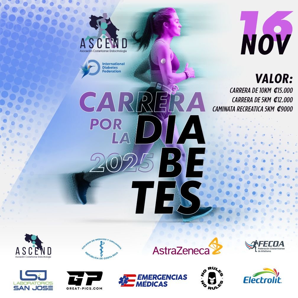 El evento se realizara el 16 Noviembre a las 6:00am en La Sabana, tendra distancias de La I Edición Carrera por la Diabetes 2025 contará con un recorrido único para las dos distancias competitivas de 5K y 10K (doble circuito), así como para la caminata recreativa de 5K. La salida, recorrido y meta estarán ubicados en las instalaciones internas del Parqueo Público del Colegio de Médicos y Cirujanos, en La Sabana, San José. La ruta comprende la Avenida de los Médicos (Contraloría), la Avenida 10 y la periferia urbanística de Sabana Sur. Se trata de un trazado exclusivo y completamente plano, diseñado en beneficio de la Asociación Costarricense de Endocrinología (ASCEND), para apoyar la investigación, prevención y tratamiento de condiciones médicas relacionadas con la diabetes en Costa Rica. Este evento se realiza bajo los Estándares Técnicos de Calidad Candelaria Internacional®.Costo (Colones) - IVA Incluido 5K ₡12,000 10K ₡15,000 Caminata Recreativa 5K ₡9,000